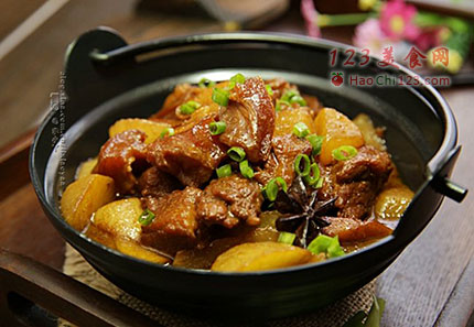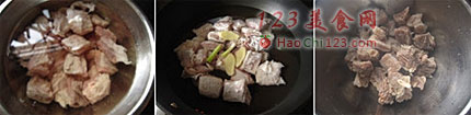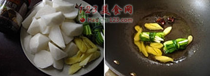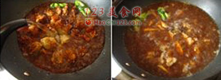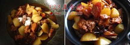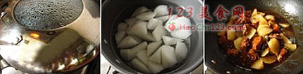 3、盖上盖子转小火焖煮1.5小时。白萝卜块用锅煮软(大火煮15分钟左右)后倒入牛腩锅内,烹入盐与糖调味,炒均后再小火焖煮至萝卜入味即可。