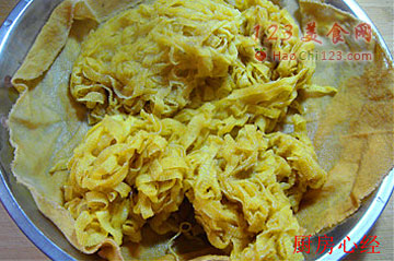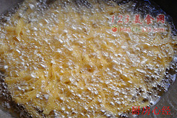 3、炸制以后的豆腐丝会黏连一起,不要紧的,上蒸锅蒸制10分钟。