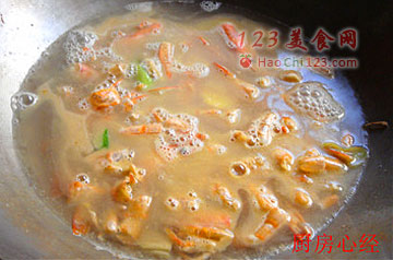 5、锅中放油,爆香葱姜、虾头和虾皮。冲入开水、料酒,煮制5分钟后,捞出食材不用。