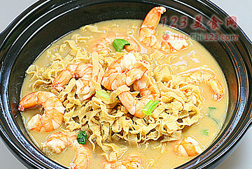 6、放入蒸制后的豆腐丝、虾仁煮制5分钟。调入胡椒粉、盐即可出锅。