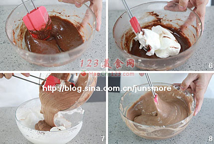 7、混合好的面糊全部倒回蛋清碗里。