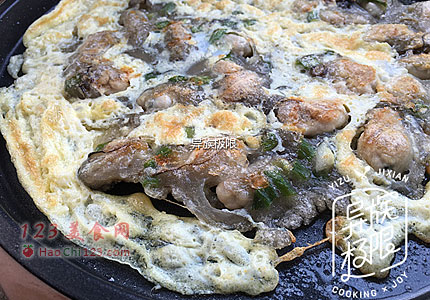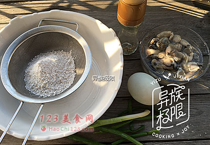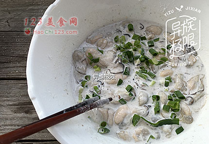 2、鲜蚝的水分很多,无法沥干,直接把地瓜粉筛入即可,不需要额外加水。