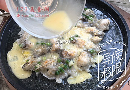 8、鸭蛋打入碗里,滴入2-3滴辣椒油搅打均匀;蛋液打匀后开盖,这时可见盘中的蚝烙已有雏形,表面少量金黄,将蛋液倒入加热盘里,盖上盖。