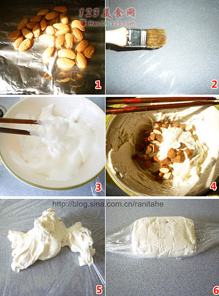 5、6、然后用勺子将混合物勺到保鲜膜上,然后包好捏成长方体,放入冰冻室冰冻1-2小时直到彻底变硬。