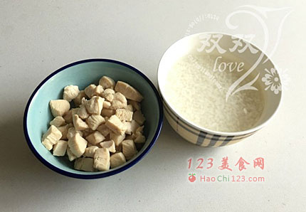 2、大米放水中浸泡1小时备用,鸡胸肉控干水份备用(如果你想早晨喝粥,大米可以提前一晚浸泡,鸡胸肉也可以提前一晚焯水,放冰箱冷藏,第二天早晨起来就直接煮,省时)。