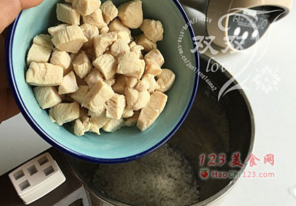 3、大米洗净,放入豆浆机内。鸡胸肉放入豆浆机内(豆浆机的鲜肉功能会有两次简单的搅打,把鸡肉打成小碎,所以鸡肉切丁即可,不用太碎)。