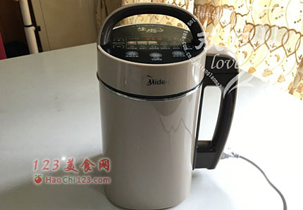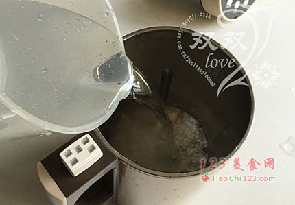 4、根据豆浆机的容量倒入清水(如果家里有高汤可以用高汤代替清水,滋味更浓郁,营养更丰富。当然如果是浓汤宝之类的,就不要用了,它里面还是有味精之类的添加剂的)。
