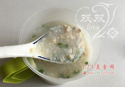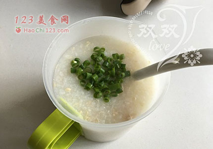6、工作完成,加入适量的盐调味。滴入少许香油。加入少许小葱碎或者青菜碎,搅匀即可(加入少许青菜碎、胡萝卜丁等使粥品颜色丰富)。