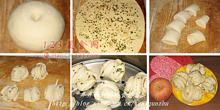 1、葱香椒盐花卷是家庭面食中常见的,它和馒头的基本做法一样,只是多了一道擀皮翻花的步骤。