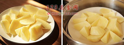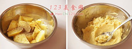 2、取出蒸熟的土豆块,放入料理盆内,磨上适量的黑胡椒粉和咸味沙拉酱,用勺子把土豆块压成泥后拌均匀即可。