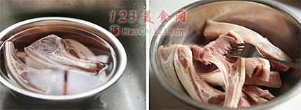 1、羊排解冻后用清水泡洗去血水和杂质,要换几次水,直到水干净为止,在洗好的羊排上用叉子扎上小孔以便能更好的入味。