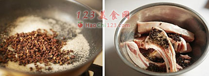 2、取一干净炒锅,放入盐炒离熟后加入花椒炒出香味后盛出,将炒好的花椒与盐倒在羊排上,加入生抽和料酒抓均。