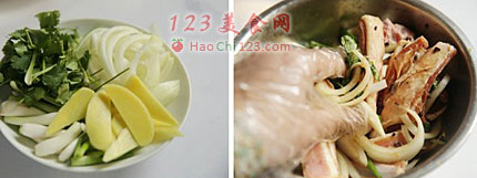3、洋葱去皮后切成粗丝,小葱和香菜择洗干净后切段,姜去皮切成片;将所有材料倒入羊排盆内,再次抓均匀后盖上一层保鲜膜,入冰箱腌制过夜。