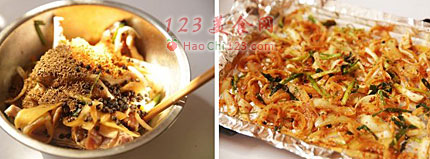 4、冰箱取出腌好的羊排,加入碾碎的孜然、辣椒粉和黑胡椒,拌均后再腌30分钟左右;烤盘内铺上一层锡纸(预留出再盖一层的长度),把腌羊排的洋葱丝和小葱香菜铺在烤盘上。