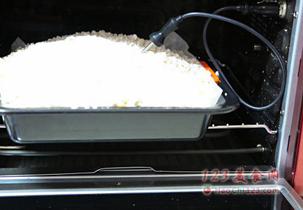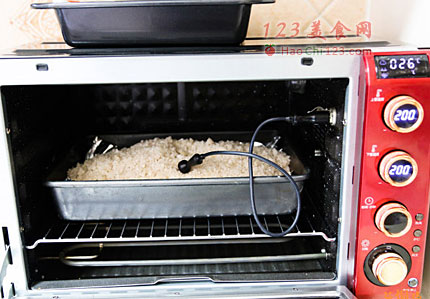 4、将海盐放入烤盘,带手套将食物探针插入鸡内,200度30分钟将盐烤热。传统的做法是用沙煲将海盐先炒热,我心疼沙煲,怕不好控制温度,改用烤箱烤热。盐的颜色由白变灰就好了。