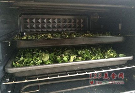 4、烤箱100度烘干,以茶叶干透为准,我大概花了3个小时(这种做茶的工艺咨询过做茶的朋友,他们也是用机器转动烘干,炒茶这个过程我可以省略。如果没有烤箱的,可以用在锅里炒干)。