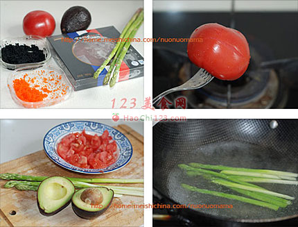3、番茄切成1CM左右的小方丁;芦笋刨去根部老皮;牛油果切半去核。