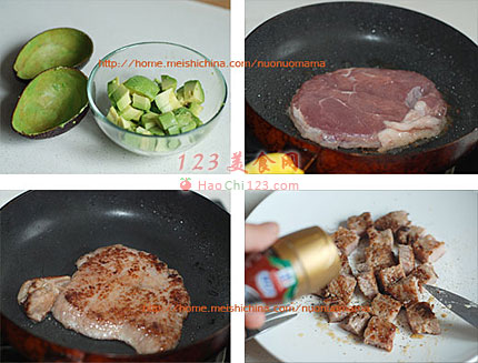 8、牛排煎好后切成1CM左右的小方丁,然后撒少许黑胡椒颗粒。