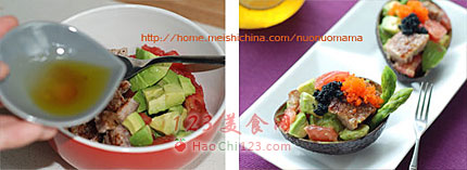 10、将拌匀的沙拉装入牛油果壳内,上面点缀些红黑鱼籽即可。