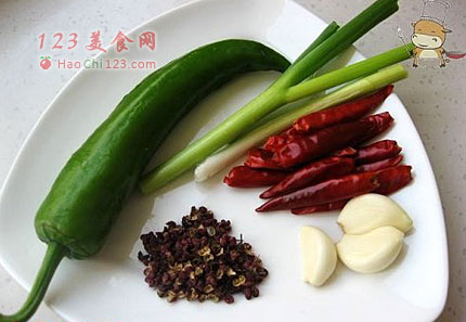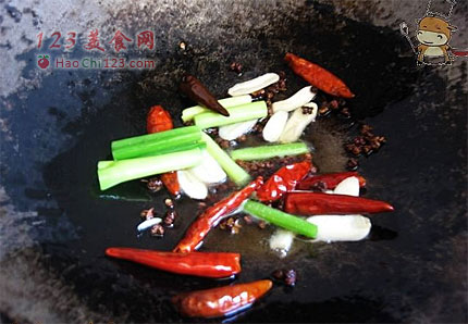 4、锅内倒入花生油,油烧热时,放入干红辣椒、麻椒粒;炸出香味后,放入葱段和蒜片煸炒。
