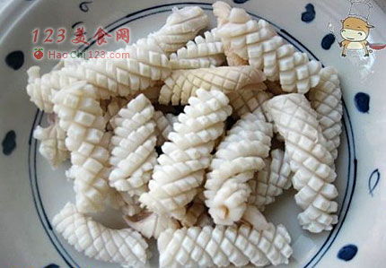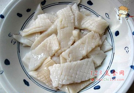 2、鱿鱼去膜洗净后,平铺在案板上,改成十字花刀,切成小段备用。