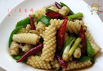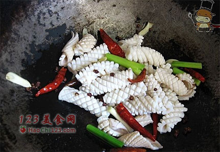 3、锅内倒入清水,水开以后下鱿鱼,打(起)卷后即捞出,马上用冷水过。