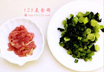 2、里脊肉切成肉丝,姜切丝,肉丝里加入姜丝与料酒拌匀腌制10分钟。雪菜洗净、切碎。