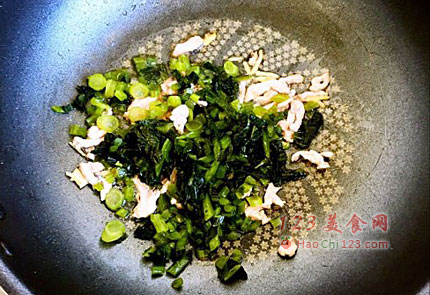 4、在熬粥的时候,炒锅放油烧热,放入腌好的肉丝,煸炒至变色,放入雪菜,翻炒一会儿,出锅。