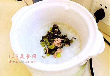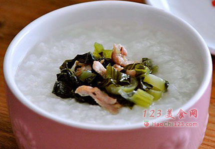 5、把炒好的肉丝和雪菜倒入熬好的粥里,略煮片刻,就可以出锅了。