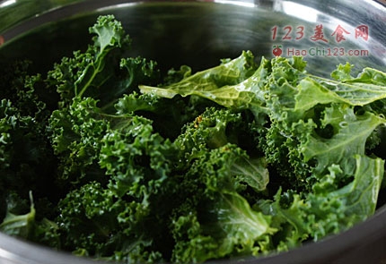 3、把羽衣甘蓝放入一个大碗,加入橄榄油用手轻轻抓匀,尽量让每一片叶子都沾上油。