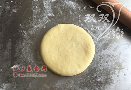 3、取一个面剂,揉匀成圆形。擀成直径约为10厘米的圆形饼。