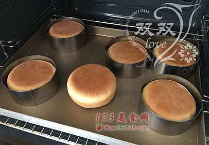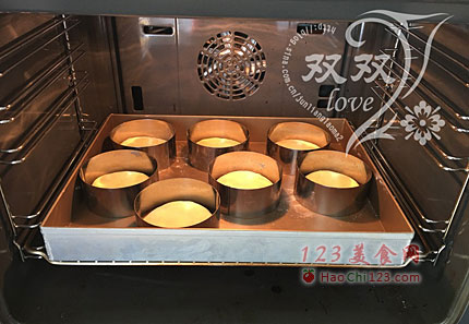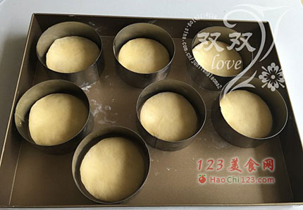 4、将喜饼码在烤盘上,用慕斯圈定型。
