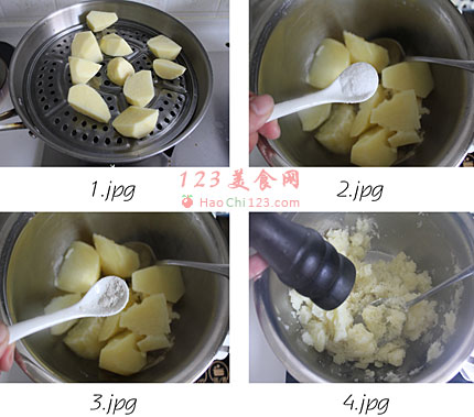 2、蒸熟的土豆,放一小勺盐。