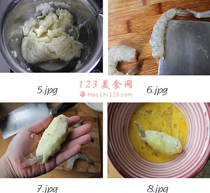 7、用土豆泥把虾包裹住,留出虾尾。