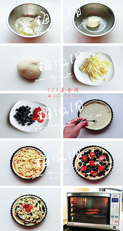 10、然后再铺剩下的奶酪丝,装饰上番茄片。