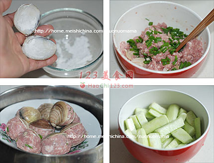 8、蒸蛤蜊狮子头的时候处理丝瓜,去皮后放盐水浸泡;白玉菇去蒂后洗净备用。