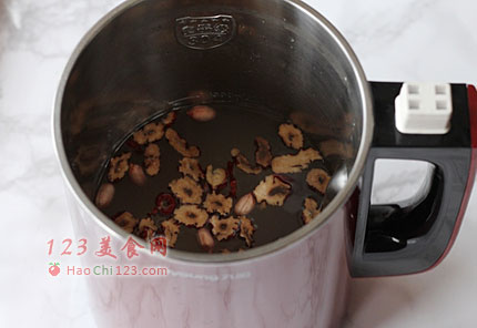 3、所有备好的食材放入豆浆机杯体中,加水至上下水位线之间。