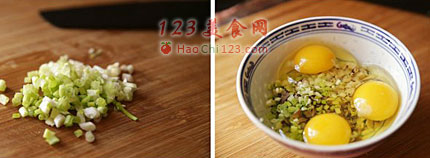 2、小葱洗净切碎,取一只大碗放入切碎的松露、小葱,磕入3枚鸡蛋。