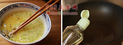 3、用少量盐调味后打散成蛋液,炒锅内倒入少量山茶油烧热。