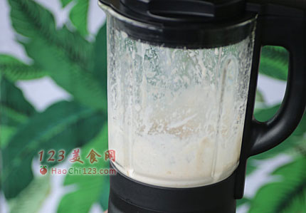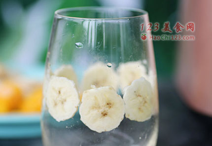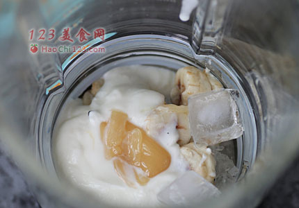 2、冻香蕉(切片后冷冻)、酸奶100克,加5毫升蜂蜜、2个冰块放入破壁机。