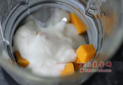 4、破壁机洗净后加入冻芒果块、酸奶100克,加5毫升蜂蜜、2个冰块放入破壁机。打碎。轻轻的倒入杯中。