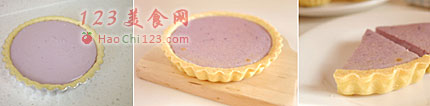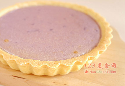 11、将紫色的蓝莓奶酪倒入已烤香的杏仁塔皮中,放入预热至130度的烤箱,烤约30分钟就好了,用低温烘烤来留住蓝莓的颜色。