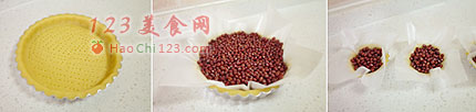 6、烤前用叉子在塔皮上扎洞,再铺上一张烘焙纸,放上适量红豆或生米,放入预热至200度的烤箱先烤10分钟定形,取出拿掉上面的红豆,再烤5分钟左右取出。