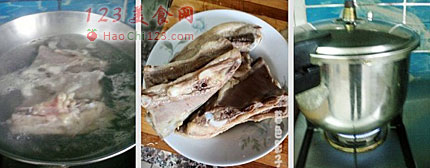 2、羊骨放料酒,用开水焯下,去除腥腻味,捞出羊骨备用。高压锅先煮羊骨上气10分钟。