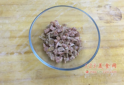 2、香肠切丁备用(我用的是我家包香肠的边角料,所以有台湾有黑胡椒,两种风味,尽量切小点,卷进去不会扎破面皮)。