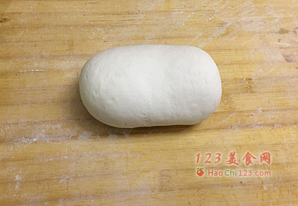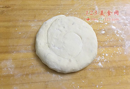 3、将发酵好的面团取出,揉匀(多揉揉,至没有气泡,表面顺滑,根据面团软硬,加入适量干面粉,做这个饼,硬点的面团更好)。