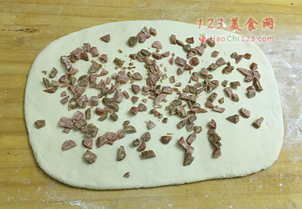4、将面团擀成长方形饼(厚度约为5mm),将香肠粒撒在饼上(如果喜欢咸味,可以提前抹油,撒点盐、花椒粉)。