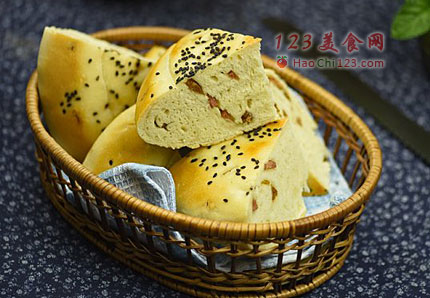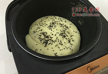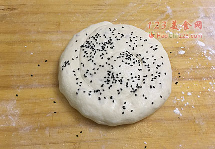 6、表面喷少许清水(有喷壶就用喷壶,没有就用毛刷刷点);撒黑芝麻点缀(因为之前洒水,所以黑芝麻撒上去就能粘住,不用用力)。