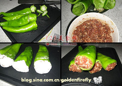 3、取一塑膠袋放入作法2肉漿,將塑膠袋一角剪一小孔,再將絞肉將擠進作法1的翡翠青椒中備用。