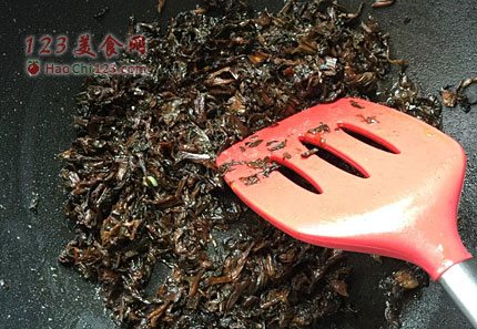 2、梅干菜泡1个小时攥干水分。锅内加入食用油,将梅干菜炒一下盛出备用。